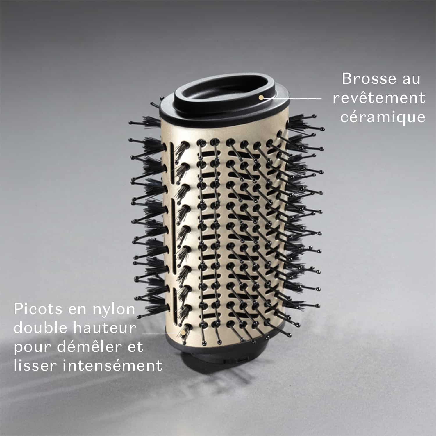 - Une brosse au revêtement céramique aux picots en nylon pour démêler et lisser intensément.